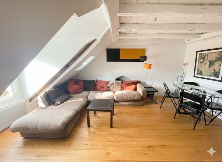 Il comprend un vaste séjour avec cuisine ouverte équipée, une chambre et une salle d'eau avec WC. Poutres apparentes. Vue dégagée et sans vis-à-vis. Immeuble ancien récemment ravalé.